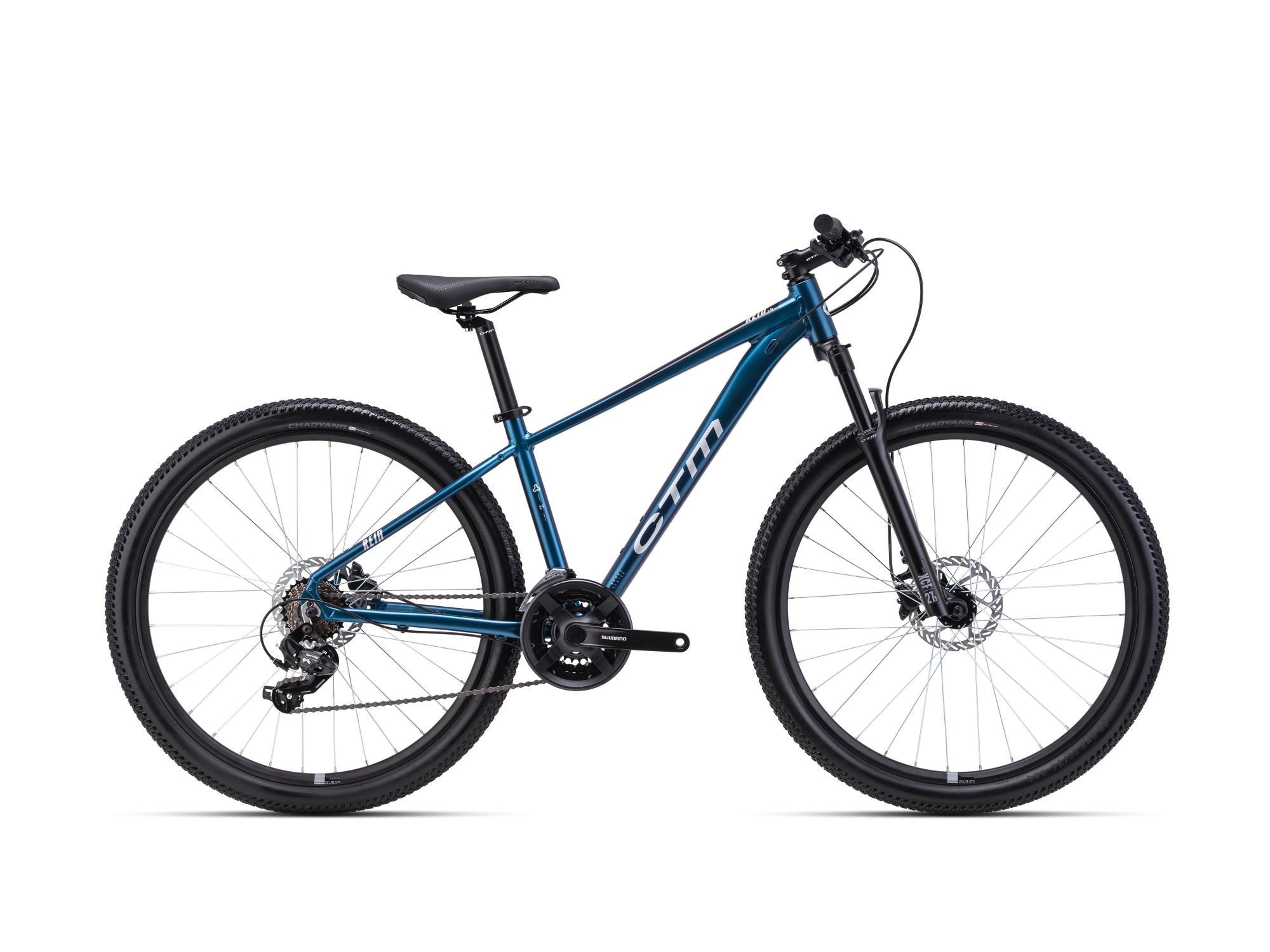 Kolo je vybaveno vidlicí CTM XCF s chodem 100 mm, která absorbuje nerovnosti terénu a zvyšuje komfort jízdy. Přesné řazení 3×7 zajišťuje osvědčená sada Shimano Tourney s řadicími páčkami SLM315. Hydraulické kotoučové brzdy Shimano MT200 poskytují spolehlivé a bezpečné brzdění v každém počasí.