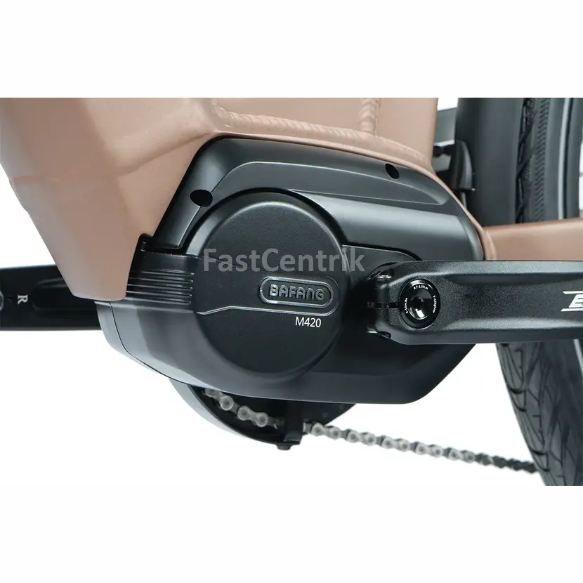 Elektromotor Bafang M420 vyniká velmi plynulým a tichým chodem a nadprůměrným výkonem. Nabízí nominální výkon 250 W, max. výkon 550 W a vysoký kroutící moment až 80 Nm. Je vybaven torzním snímačem síly šlapání. To znamená, že čím větší silou cyklista šlape, tím větší silou mu motor pomáhá. K motoru lze namontovat snímač řazení (Gear senzor), který vám umožní snadno a rychle měnit rychlosti za všech okolností.